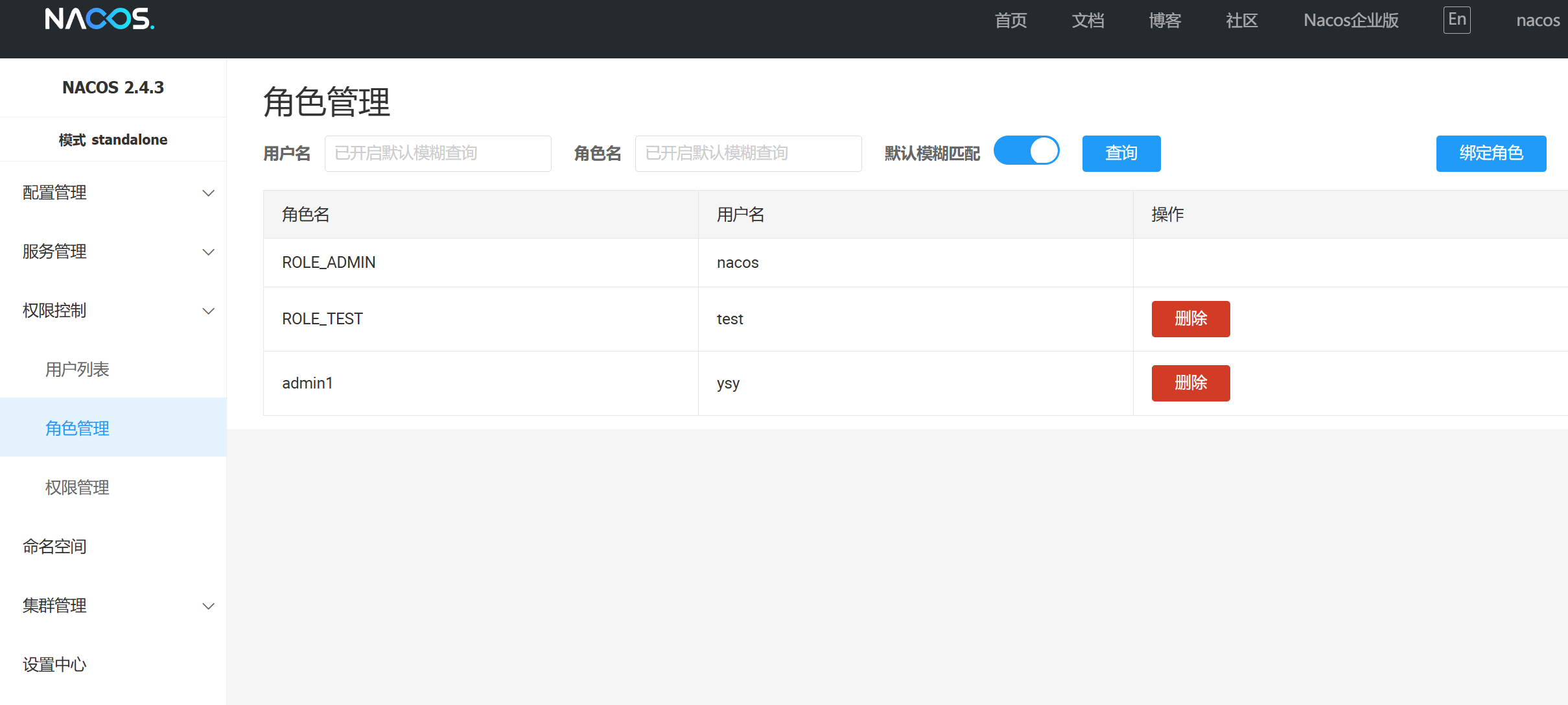 初始启动,管理员账号为nacos,密码会让你先初始化设置,默认为nacos,登入只会便可以在权限控制的地方增加账号,或者修改密码,只有ROLE_ADMIN(初始为nacos的账号)有权限控制的权限